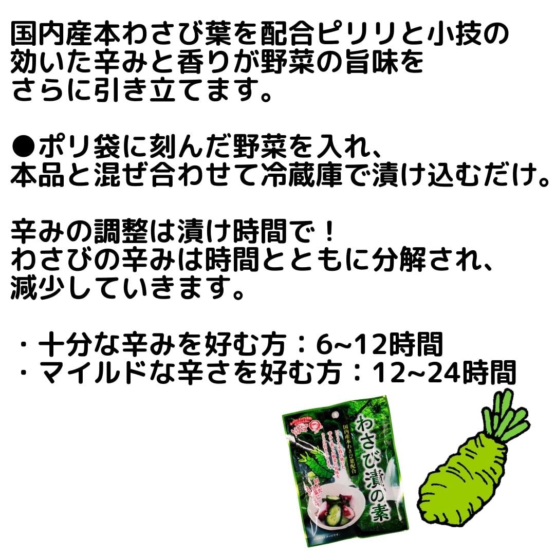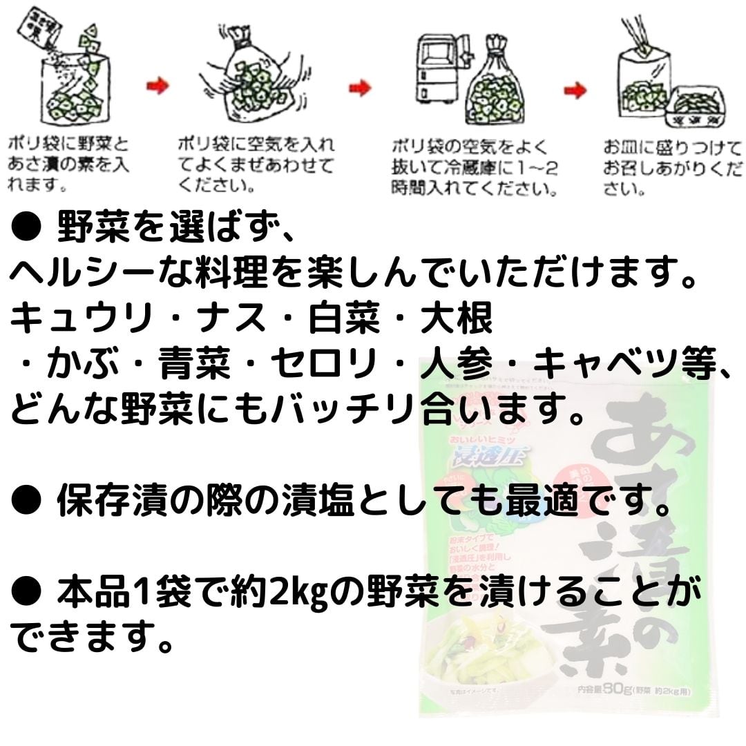 商品説明文: 奈良つけもん屋つけもとのあさ漬の素は、野菜に混ぜるだけで簡単に浅漬けが作れる粉末タイプの漬物の素です。野菜の水分を引き出し、短時間で美味しい漬物が楽しめます。お好みの野菜を使って、自宅で手軽に漬物を作りたい方に最適です。調理も手軽で、家庭の食卓にぴったりの一品です。