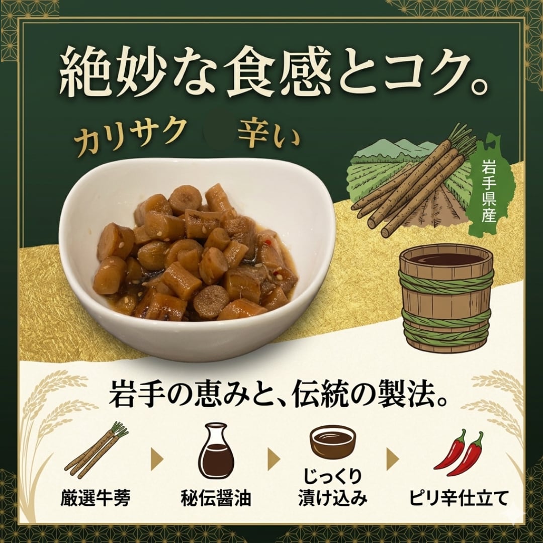主役となる牛蒡(ごぼう)は安心の国産。国産の海塩で丁寧に漬け込み、ごぼう本来の風味と、噛むほどに広がる小気味よい「シャキシャキ」とした食感を大切に仕上げました。