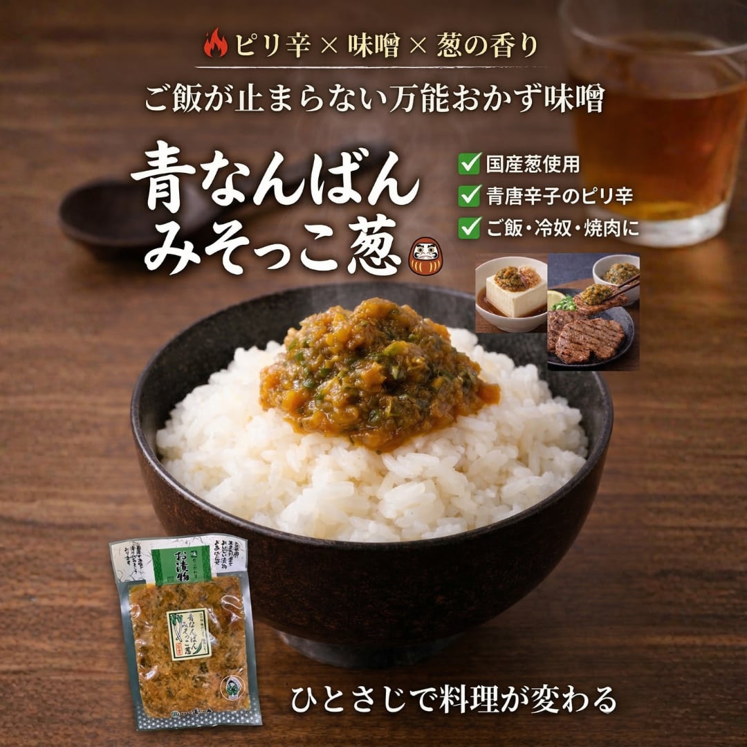 ピリリと辛い青唐辛子(青なんばん)を秘伝の味噌で漬け込んだ「みそっこ」シリーズは、一口食べればお米が止まらなくなる美味しさ。国産原料にこだわり、素材の食感を活かした職人仕込みの味わいをお楽しみください。